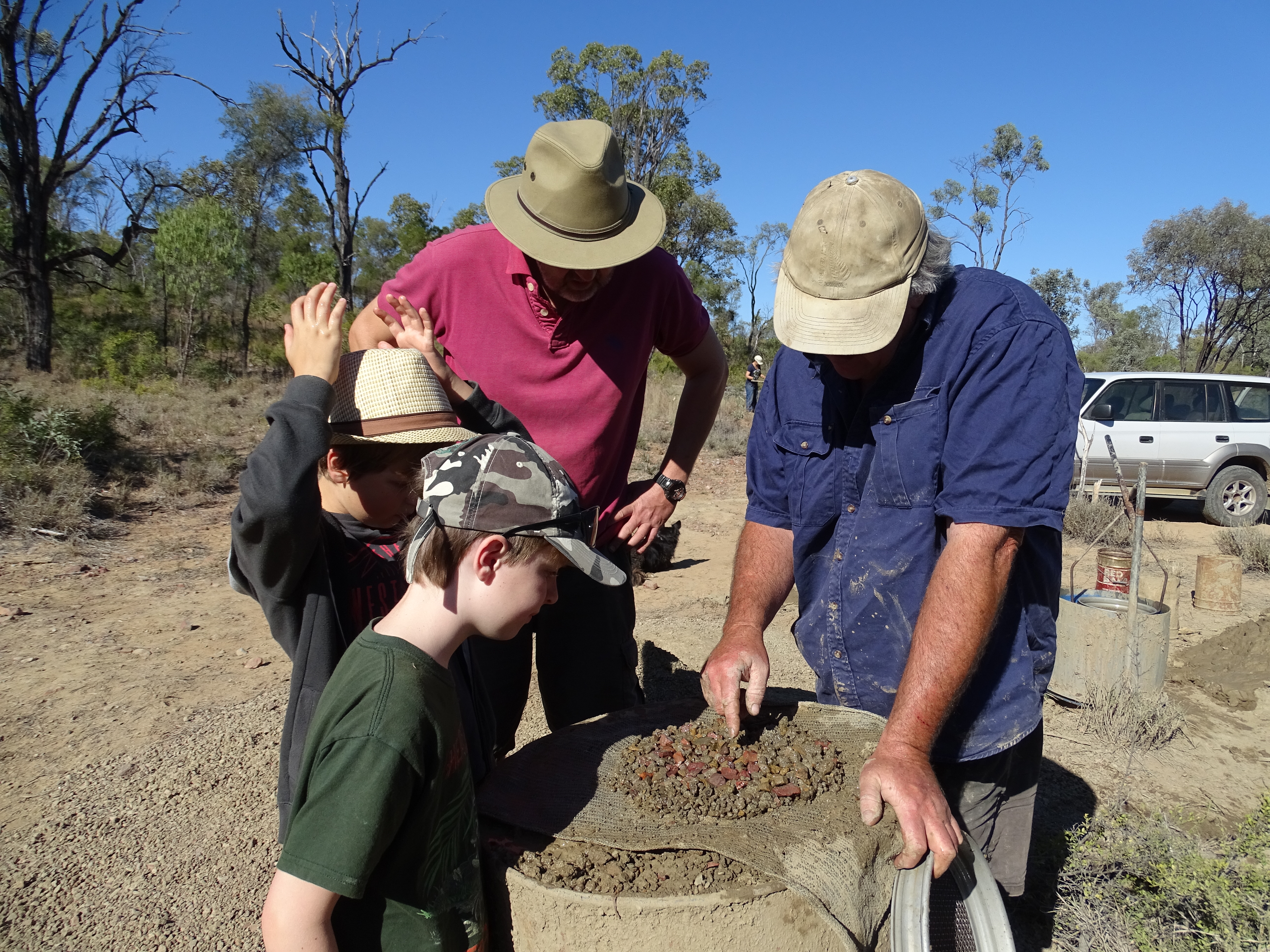 We drove to a remote dry riverbed and armed with pickaxes, shovels, sieves and rock washing equipment, we set to work – and very hard yakka (work) it was! Four hours of digging in rock hard dirt and our reward was 2 sapphires and 3 zircons and very big blisters. The boys were great helping us dig – they got gem fever after spotting the shiny little gems amongst the wash (young eyes are a good for this). 60% of the worlds sapphires are found here, greens, blues and even pinks, unfortunately ours were too small to be of much value but Ollie did find one large orange zircon that we are having cut into an oval. We also stayed in a great campsite here with a nightly campfire and a chat with other travellers – this is how you pick up the best travelling tips.