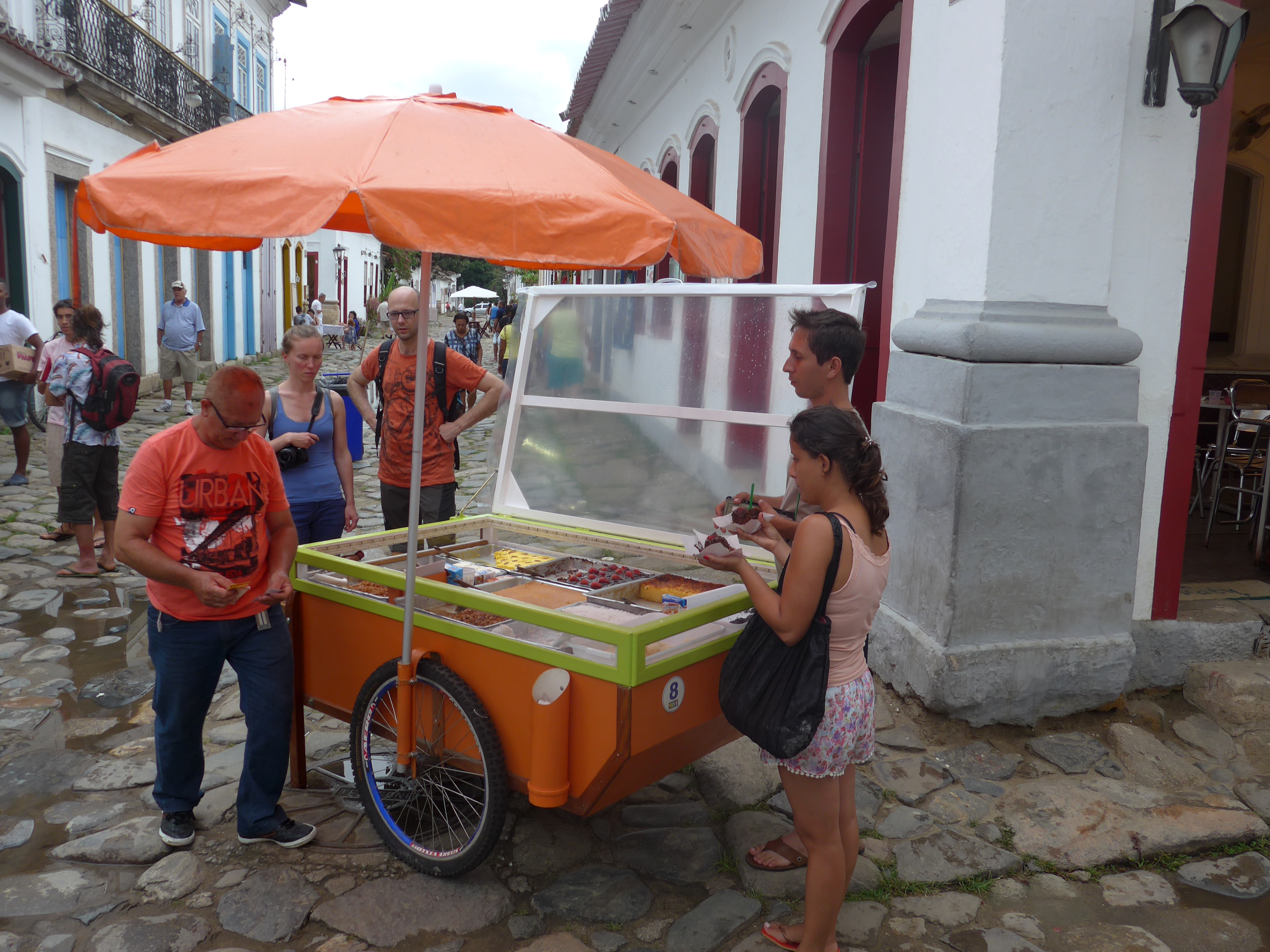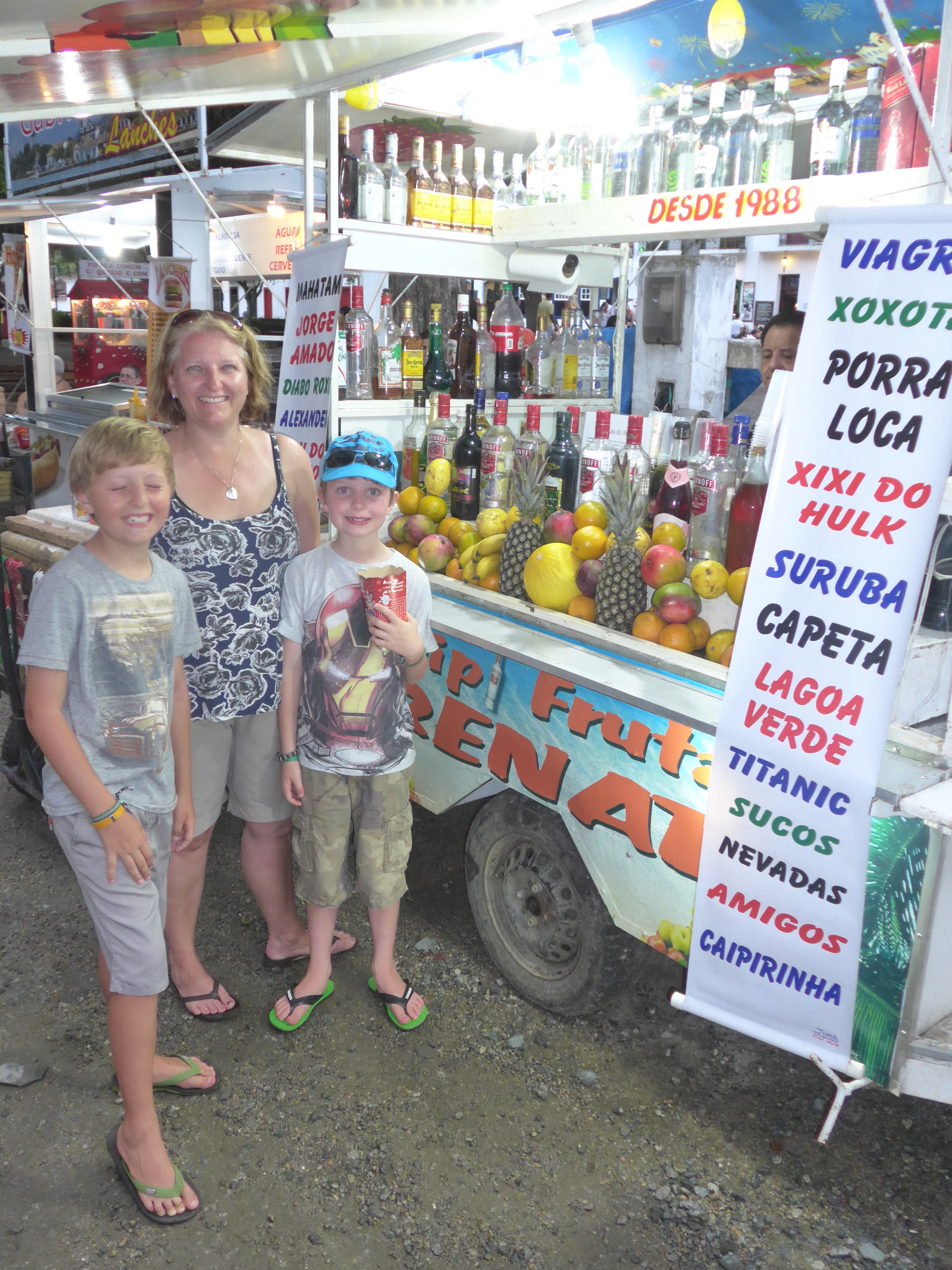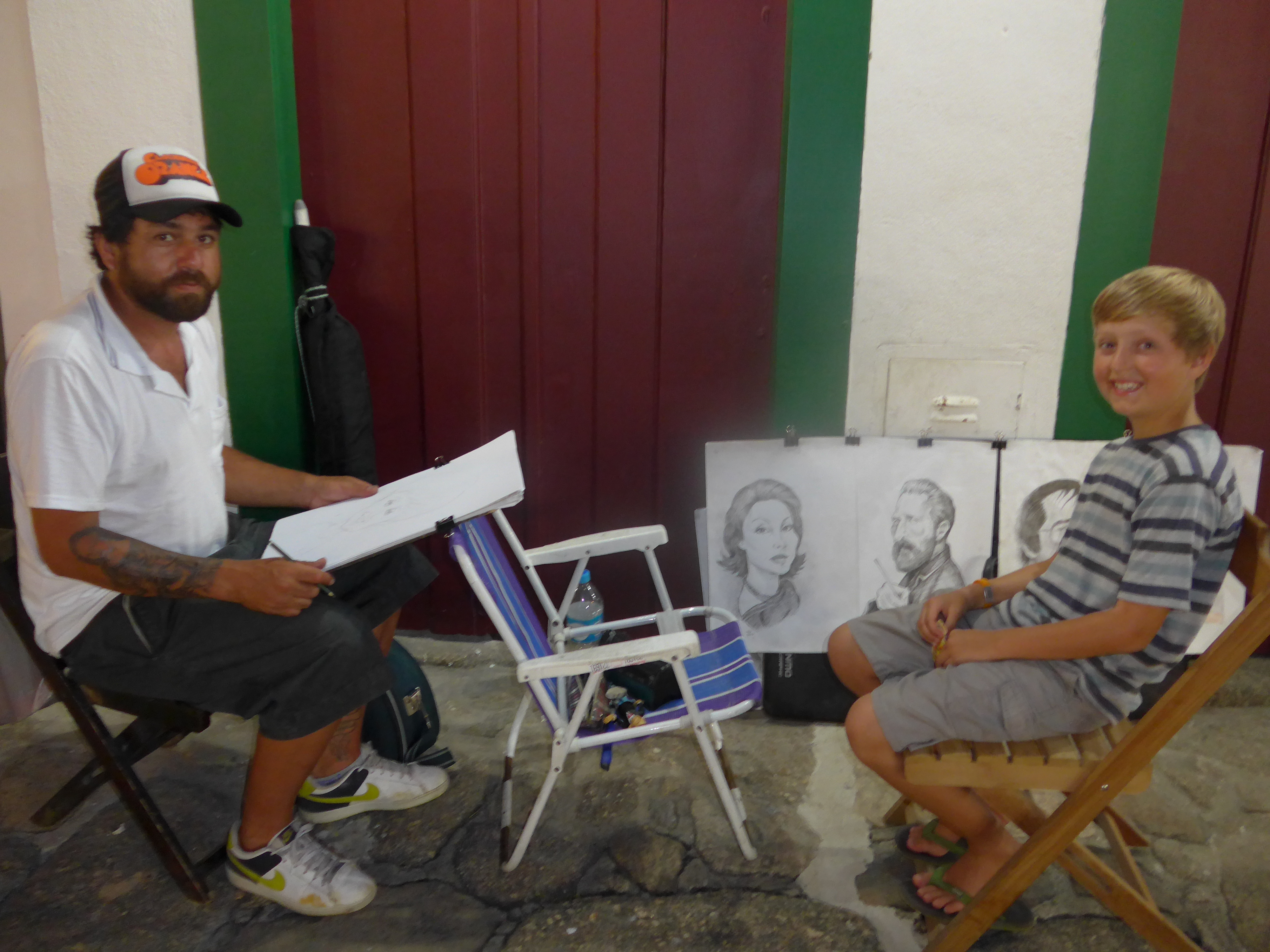 is a pretty colonial town of brightly coloured doorways and cobbled streets. It is obviously a popular tourist destination for Brazilians from Sao Paolo and Rio as the shops are boutique and well stocked with souvenirs, and many restaurants have menus in English, which is a little less fun than ordering ‘carne’ and wondering what kind of meat will arrive! The boys both had a cartoon drawn of themselves by a local street artist and we’ve bought some Brazilian flag sarongs to use on the beach as they dry so quick (as no one seems to use beach towels.). Street vendors also sell churro’s here, thank goodness, but they also make fresh cocktails to go, so Ben & I are sorted too!